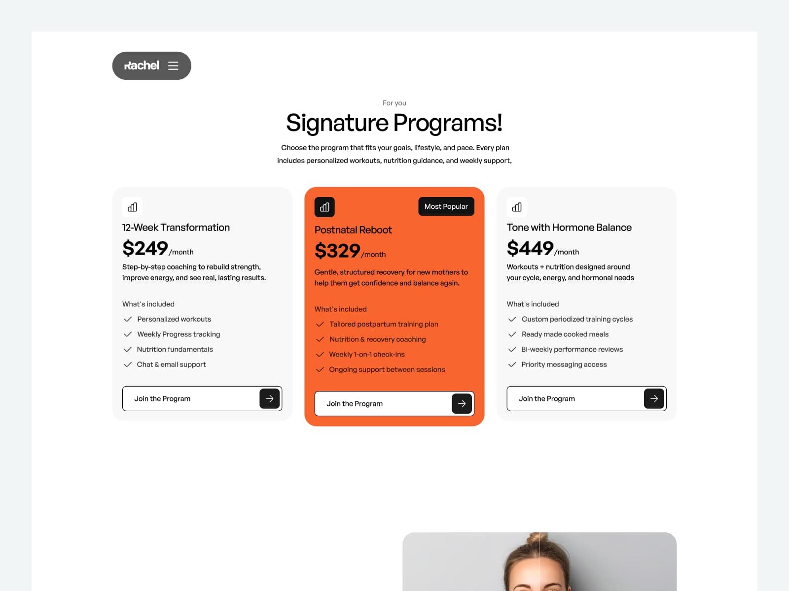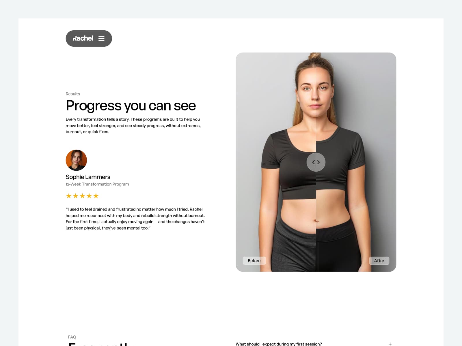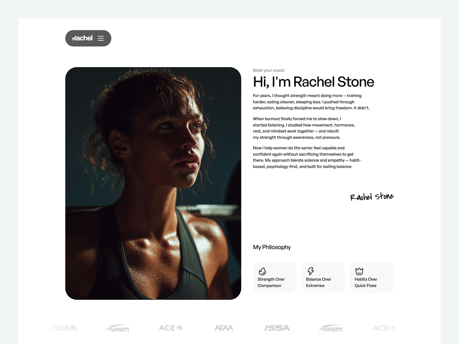 Rachel Fit Personal Fitness Trainer Template is a Framer design template designed for personal trainers and fitness coaches either women or men. It provides a clean and structured layout that helps you work faster with a structured design foundation.